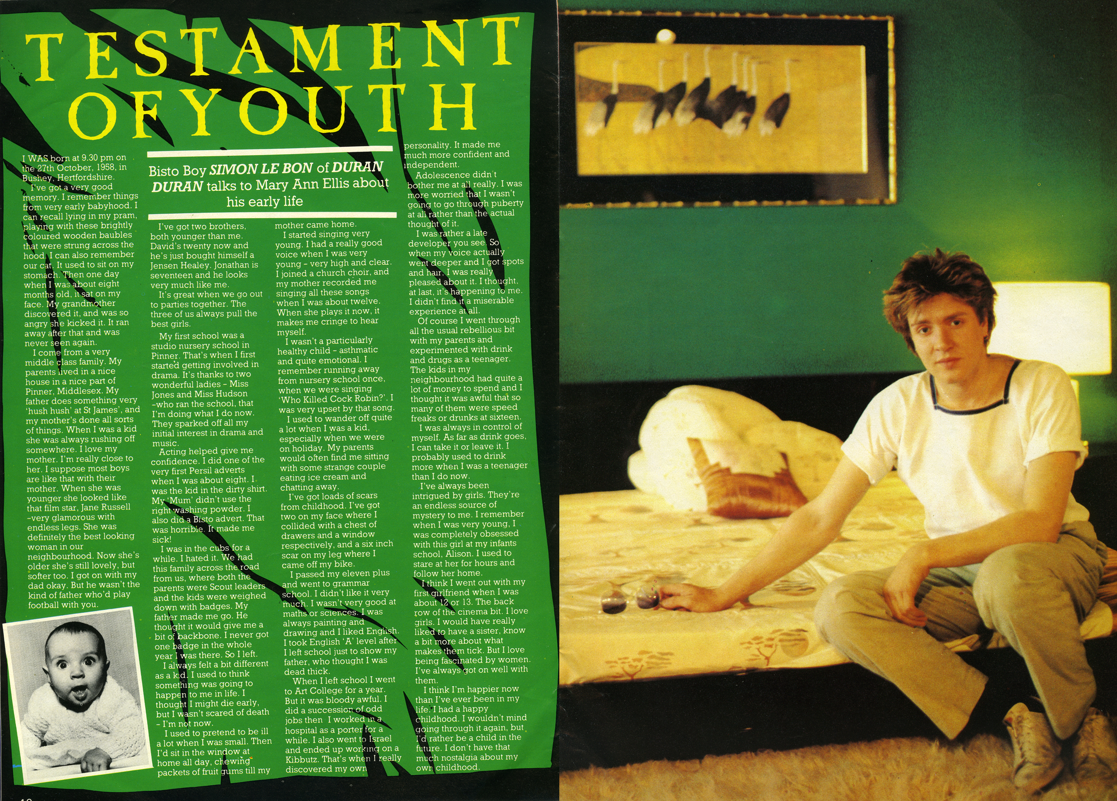 In his Testament Of Youth, Simon Le Bon reckoned his mum used to look like Jane Russell – ‘very glamorous with endless legs.’ He had a very middle-class upbringing in Pinner, Middlesex, and remembered being asthmatic and quite emotional - running away from nursery school after getting upset singing, Who Killed Cock Robin?