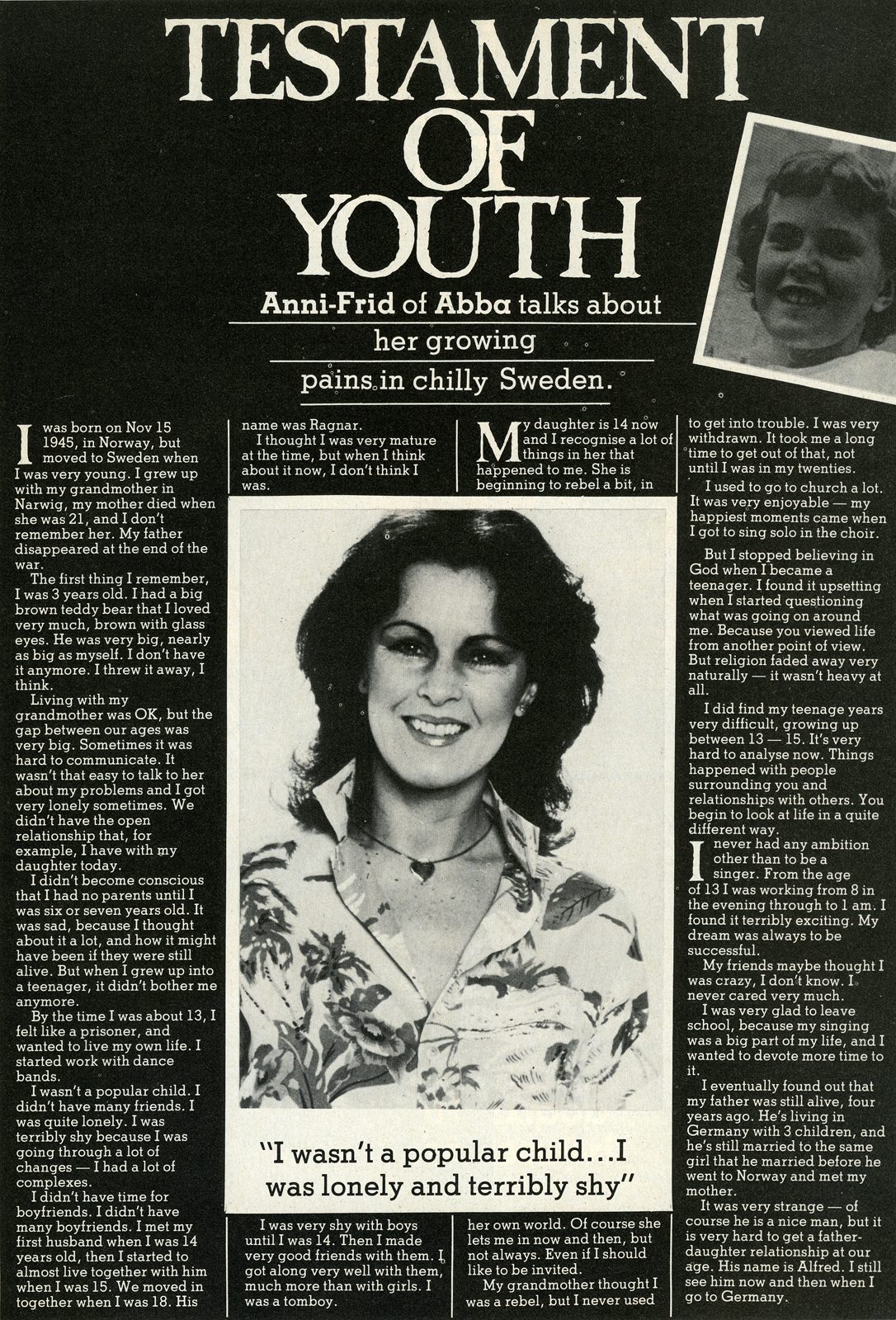 ABBA’s Anni-Frid surprisingly did a Testament Of Youth in issue 7. She was brought up in Norway by her grandmother after her mum died aged just 21 and her dad disappeared at the end of the war. As a teenager she had many complexes and married her first boyfriend who she met when she was 14. She found out her dad was still alive four years before the interview. He lived in Germany with his family.
