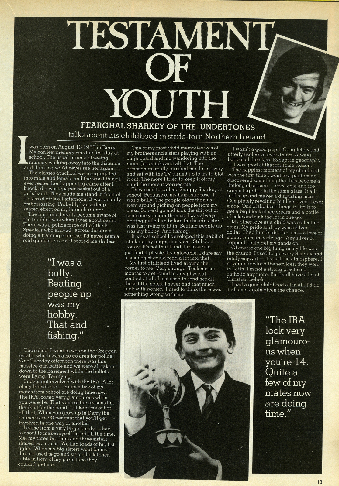 Fearghal Sharkey admitted to being a bit of a bully growing up in Derry. The older kids at school picked on his class, so his class would pick on the younger ones. ‘Beating people up was my hobby. That and fishing,’ recalled ‘Shaggy’ Sharkey (his school nickname).