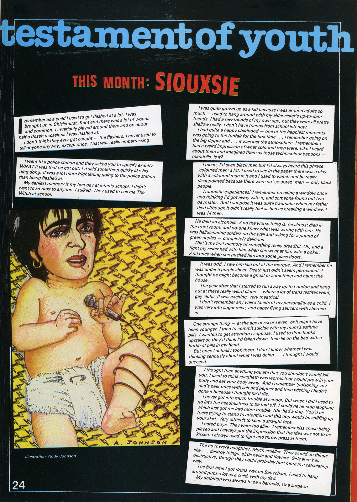 Siouxsie’s Testament was perhaps the darkest we ever published. It started out with her being a victim of a flasher, continued through her attempted suicide when she was seven by taking her mum’s asthmatic pills to the shocking death of her alcoholic father. Her ambition was to be a barmaid. Or a surgeon.